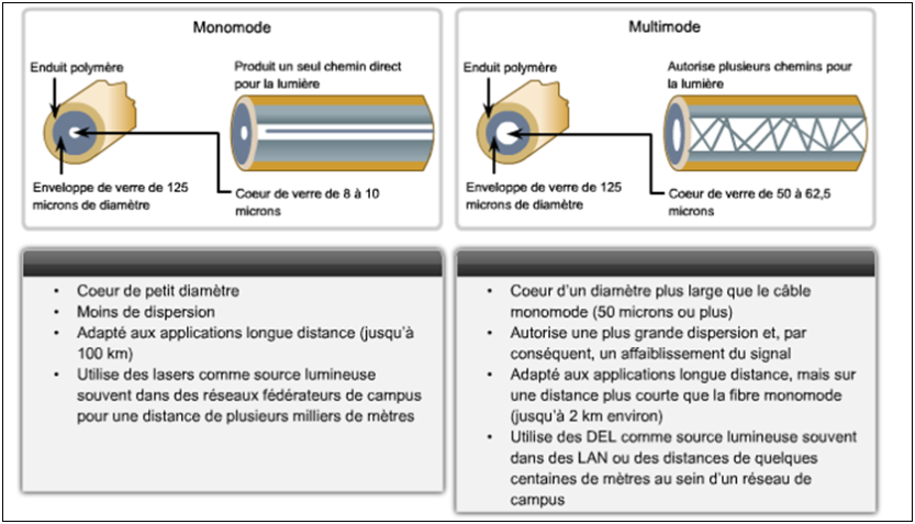 Le câblage en fibre optique utilise des fibres de verre ou de plastique pour guider des impulsions lumineuses de la source à la destination. Les bits sont codés sur la fibre comme impulsions lumineuses. Le câblage en fibre optique prend en charge des débits de bande passante de données brutes très élevés.Des lasers ou des diodes électroluminescentes (DEL) génèrent les impulsions lumineuses utilisées pour représenter les données transmises sous forme de bits sur le support. Des dispositifs à semi-conducteur électronique appelés photodiodes détectent les impulsions lumineuses et les convertissent en tensions qui peuvent ensuite être reconstituées en trames de données. |