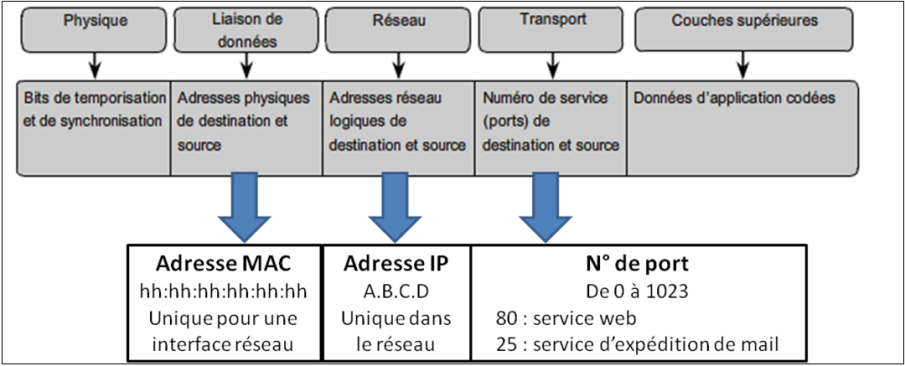 Il existe plusieurs types d'adresses qui doivent être incluses pour livrer correctement les données depuis une application source exécutée sur un hôte à l'application de destination correcte exécutée sur un autre. En utilisant le modèle OSI comme guide, nous apercevons les différents identificateurs et adresses nécessaires à chaque couche.