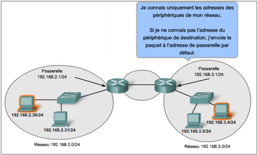 Au sein d'un même réseau, les hôtes communiquent entre eux sans nécessiter de périphérique intermédiaire. Quand un hôte doit communiquer avec un autre réseau, un périphérique intermédiaire sert de passerelle avec l'autre réseau.