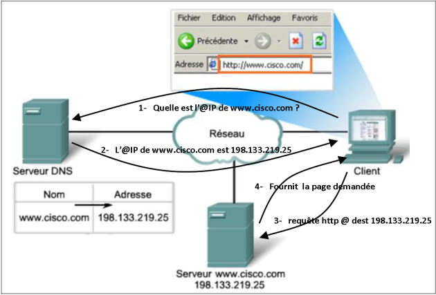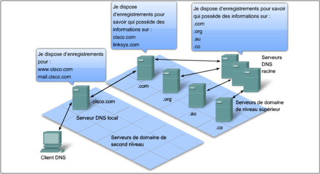 Sur Internet, ces noms de domaine (par exemple, www.cisco.com) sont beaucoup plus faciles à mémoriser que leurs équivalents numériques (par exemple, 198.133.219.25, l'adresse numérique du serveur de Cisco). De plus, si Cisco décide de changer d'adresse numérique, ce changement est transparent pour l'utilisateur car le nom de domaine demeure www.cisco.com. La nouvelle adresse est simplement liée au nom de domaine existant et la connectivité est maintenue. Lorsque les réseaux étaient de petite taille, il était simple de maintenir le mappage entre les noms de domaine et les adresses qu'ils représentaient. Cependant, les réseaux étant aujourd'hui de plus grande taille et le nombre de périphériques plus élevé, ce système manuel ne fonctionne plus.