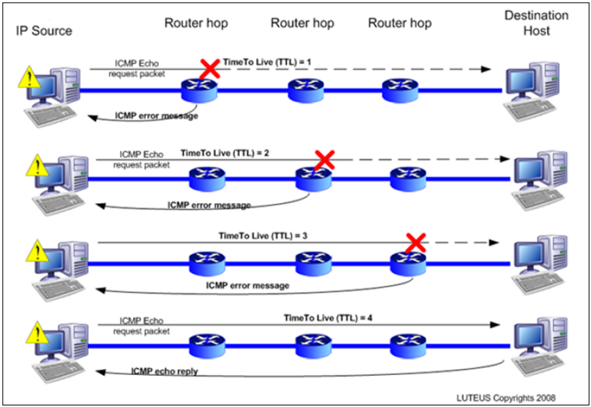 La commande traceroute utilise une fonction de durée de vie dans l'en-tête de la couche 3 et le message ICMP Time Exceeded (Dépassement du délai). Le champ TTL permet de limiter le nombre de sauts qu'un paquet peut rencontrer. Lorsqu'un paquet traverse un routeur, le champ TTL est décrémenté de 1. Lorsque la durée de vie atteint zéro, le routeur ne transmet pas le paquet, et ce dernier est abandonné.