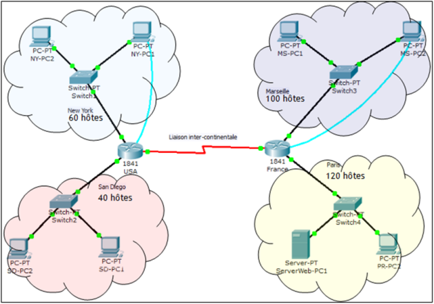 Il s'agit de mettre en place le réseau d'une entreprise internationale dont le siège social est en France à Paris et qui possède une succursale à Marseille, à New York et à San Diego.